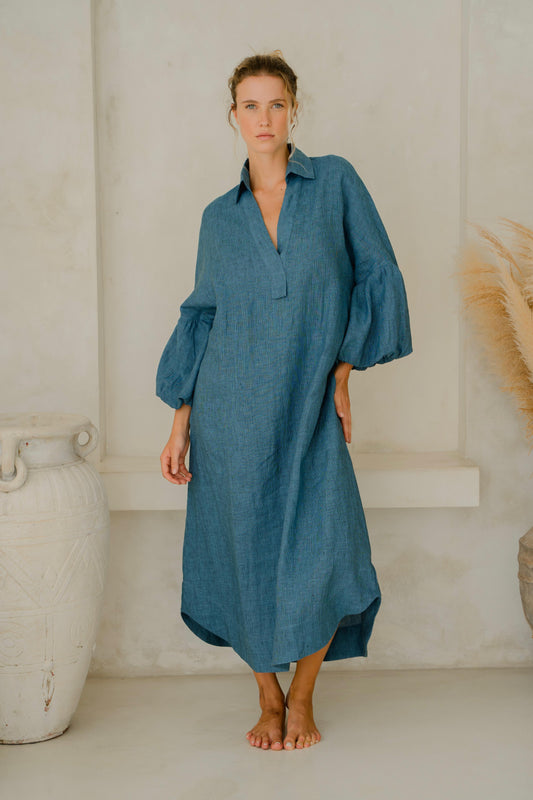 #55 Maxi H/L Kaftan Thick Placket Puff Slvs